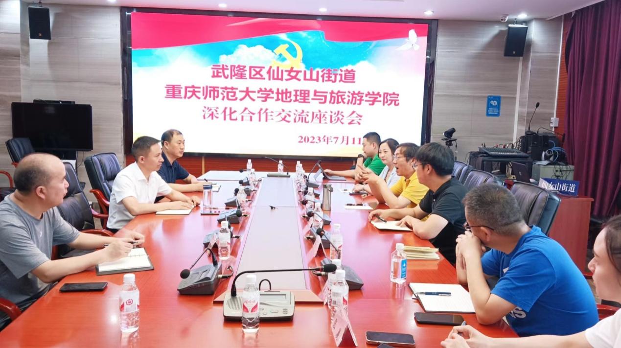 2023年7月11日,在仙女山街道三楼会议室,智慧旅游团队与武隆仙女山街道相关负责人就深化合作交流进行座谈,党委工委副书记、办事处主任李鹏程介绍了“世界最佳旅游乡村”荆竹村概况、评选“世界最佳旅游乡村”的过程以及武隆仙女山乡村旅游发展存在的问题,智慧旅游团队负责人罗仕伟教授就武隆仙女山乡村旅游发展问题清单、院长助理张云耀就建立实习基地、酒店系主任汪琳姝就加强住宿接待服务人员培训、团队秘书杨永丰就建立研究生联合培养基地等方面进行了交流。同时,以本次交流活动为契机,换妻