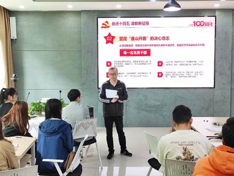 杨永丰书记首先以一则党史短片带领全体党员回顾建党百年来的伟大贡献及革命先辈的英勇事迹。他随后从“没有共产党就没有新中国”“践行初心使命、一心一意跟党走”“奋进‘十四五'、谋崭新征程”三个方面进行了阐述,深刻剖析了新时代党员干部的使命担当,并提出要从“涵养坚如磐石的政治定力”“坚定逢山开路的决心意志”“书写人民至上的幸福答卷”三个维度来传承红色基因、矢志砥砺前行。