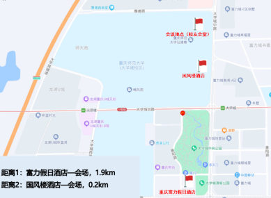 国风楼酒店(单间、标间268元/晚)。会务组可根据注册情况统一办理酒店预定。会议期间,会务组将安排车辆统一接送入住在重庆富力假日酒店的参会者。