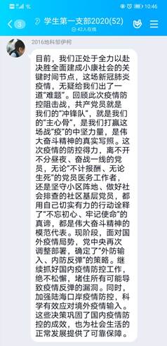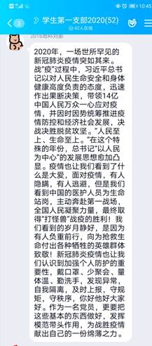 多位同学在战疫中无私奉献、敢于担当的突出表现,同时号召一支部全体学生党员向他们学习。接下来,邹梦芸同志分享了她在疫情期间在高速路口为期八天的志愿者工作心得,赞扬了医护人员不畏艰辛、积极奉献的精神;张璐同志分享了身边的党员案例,小区门禁因人手不足,党员带着几岁的孩童上岗工作,这种无私奉献的精神值得所有党员同志学习;马君草同志分享了对钟南山院士先进事迹的感悟,号召党员同志学习钟南山院士“说实话,办实事”的精神;许晓同志通过中外现状对比,看到了祖国的强大,国家能够保障人民生活;熊瑜丽同志对身边在医院工作的亲人的工作历程进行分享,先进事迹来自于生活点滴;任杰同志分享了人民对于疫情期间防控的积极配合,展现了人民在面对危机的团结与努力。学生第一党支部的其他线上党员都通过网络发表了自己的心得体会以及疫情期间的身边先进事迹、先进榜样。