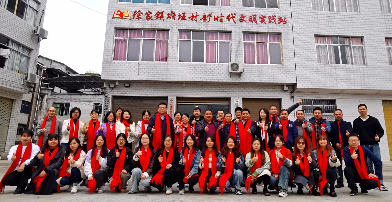 党员师生在杨国胜所驻徐家镇塘垭村新时代文明实践站前合影)