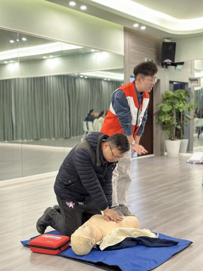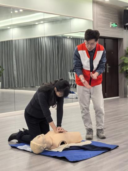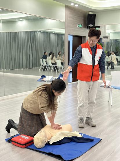 在单人急救培训之后,杨漾老师对各类不同现场的应急救护知识进行了梳理和补充,并指导胡俊希和巫昊燕两位老师进行了双人急救心肺复苏操作技能的演示。通过此次培训,教师们不仅掌握了心肺复苏等应急救护技能,还增强了自救互救意识和能力。