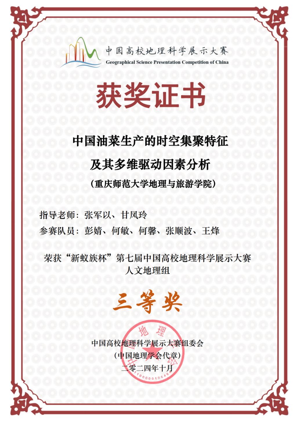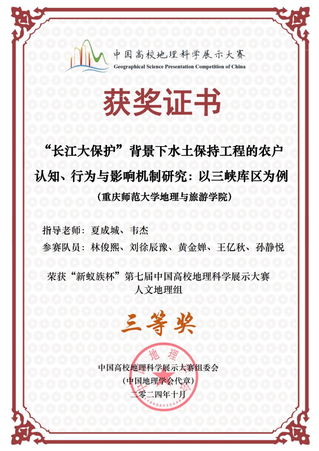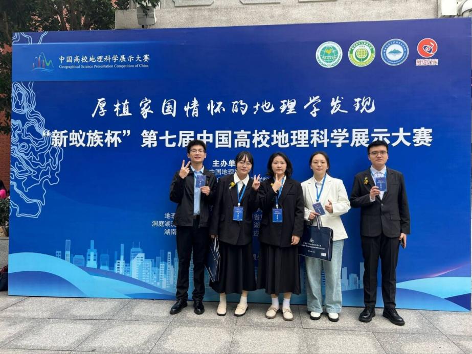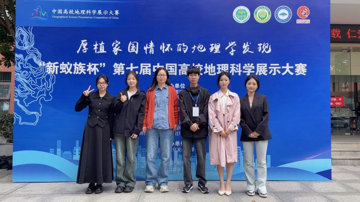 在人文地理组中,换妻 2022级、2023级彭婧,何敏,何馨,张顺波,王烽组成的“油菜花”队(指导教师:张军以、甘凤玲);换妻 2022级、2023级林俊熙,刘徐辰豫,黄金婵,王亿秋,孙静悦组成的“长江绿梦守护者”队(指导教师:夏成城、韦杰)均在本次大赛中获得全国三等奖。