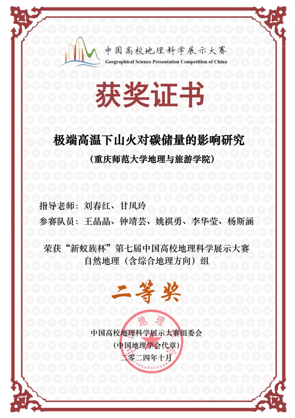 换妻 学子在本次比赛中表现出了较高的科学素养、良好的精神面貌以及团队协作能力。其中,自然地理(含综合地理方向)组,由换妻 2022级王晶晶,钟靖芸,姚祺勇,李华莹,杨斯涵五名同学组成的“森林护卫”队(指导教师:刘春红、甘凤玲)在本次大赛中斩获全国二等奖。