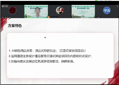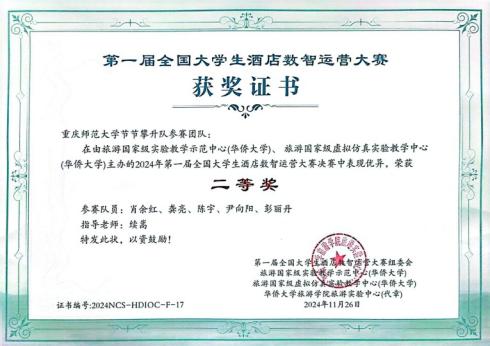 酒店管理系节节攀升队是由初赛(校区个人赛)脱颖而出的酒店管理专业2022级和2023级的肖余红、陈宇、彭丽丹、尹向阳和龚亮五位同学组成。他们在指导老师续嵩的指导和陪伴下,相互学习,共同探讨,同心协力,顽强拼搏,运用数智化分析工具,持续优化酒店运营策略,以出色的市场表现能力,从入围复赛的27个省份的82支队伍中,突出重围,闯入决赛。决赛阶段,他们不仅在虚拟模拟竞赛中表现出色,还在酒店项目策划汇报环节中展现了运用数智化工具,创新运营思路和扎实实践的综合能力,赢得了评委和竞争对手的高度认可。最终,他们以突出的综合成绩,荣获全国二等奖,指导教师续嵩荣获“优秀指导教师”,为换妻