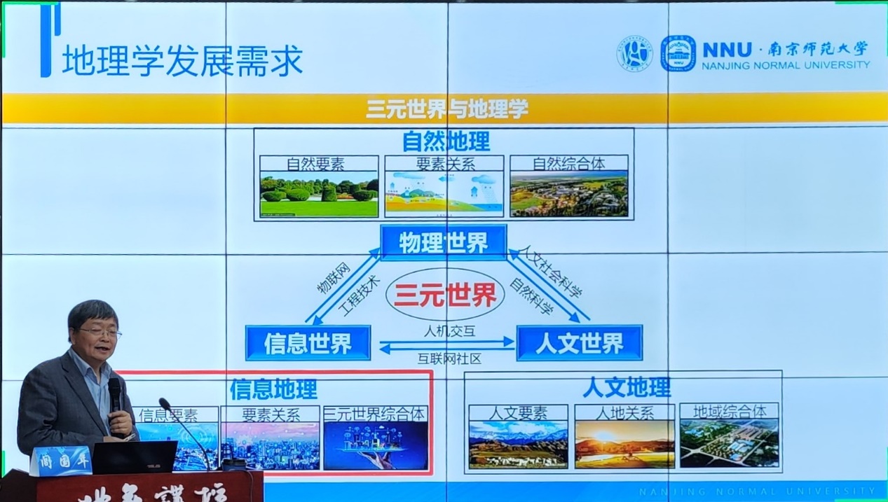闾国年教授从地理信息科学发展规律、地理学发展需求、地理信息学科发展趋势三个方面,结合GIS应用案例,系统的介绍了GIS的源起与发展,地理学发展的初心和目标、信息地理学的研究对象,提出了未来地理信息科学的主要特征和主要研究内容。报告引起了大家的广泛兴趣,报告结束后,大家积极提问,闾国年教授与在座师生就GIS学术研究、GIS在中学地理教学中的应用等问题进行了深入互动交流