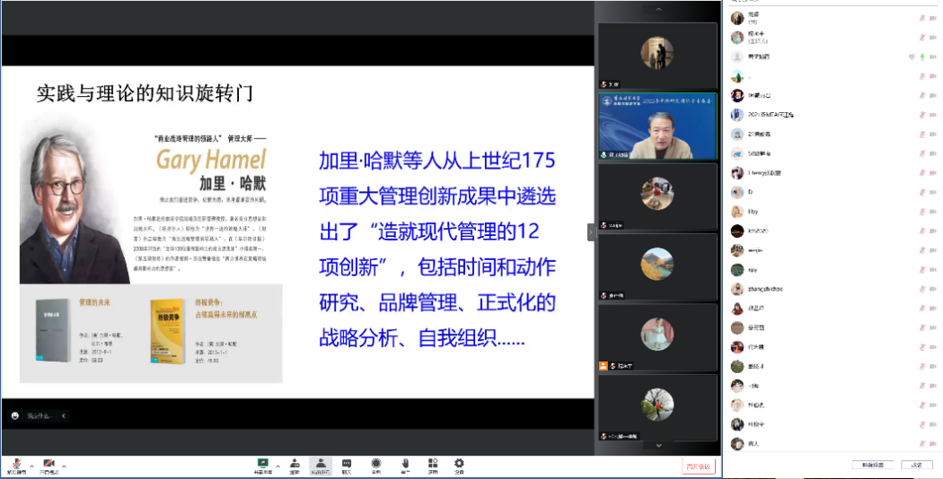 师生介绍了智能时代的幸福产业。对新时代的特征、VUCA环境进行了解读,阐述了新时代中国管理研究面临的机会与挑战,以及当今管理教育与研究亟需解决的新课题。随后对元宇宙文化的商业模式和功能特征进行了分点论述,提出元宇宙具有开创新空间、驱动新创意、催生新消费的功能,并进一步介绍了元宇宙产业链和学术概念,总结了智能时代文化产业、旅游业等幸福价值研究的意义和方向。最后以重庆、西安、杭州等地打造优质旅游目的地的实践智慧为例,强调了案例研究在理论印证中的重要作用。