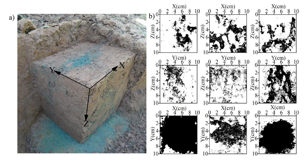 图1 埂坎染色形态:a)埂坎三维坐标系;b)埂坎三维剖面染色形态