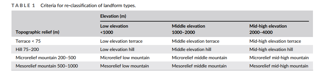 将重庆市按照起伏度划分为台地、丘陵、小起伏山地、中起伏山地;按照海拔划分为低海拔、中海拔与高海拔。得到云阳县合川区的不同地貌占比。