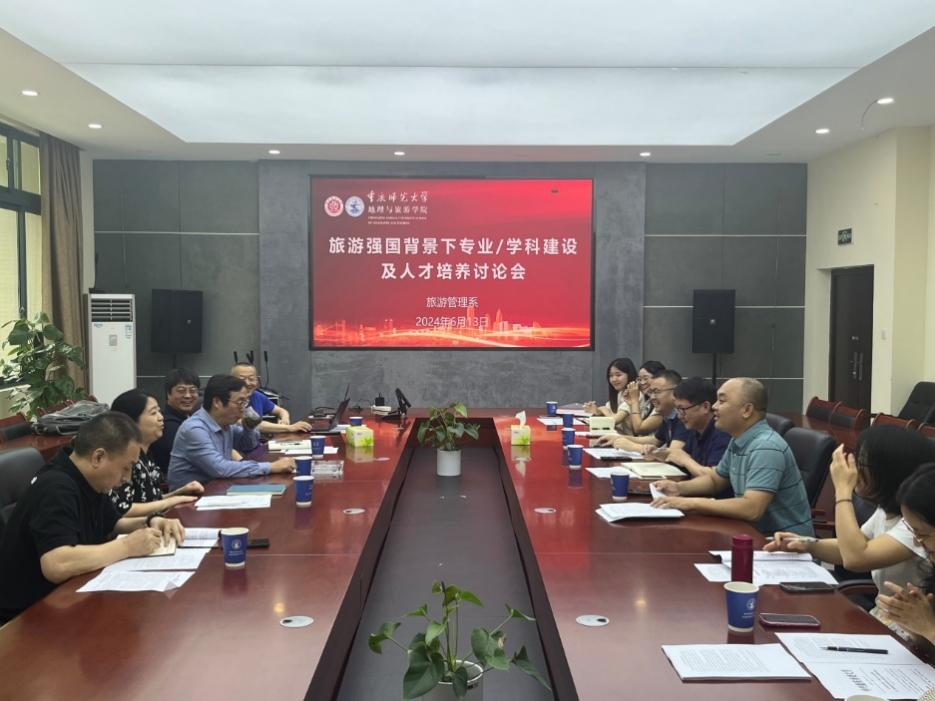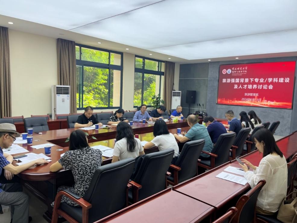 2024年6月13日下午,旅游管理系举办了旅游强国背景下学科专业建设及人才培养讨论会。讨论会旨在为旅游管理学科专业建设探索及人才培养改革建言献策,助力重庆加快建设世界知名旅游目的地与新质生产力发展。学院党委书记胡芳,副院长曹华盛教授,副院长张云耀教授,全域智慧旅游重庆市2011协同创新中心主任罗仕伟教授,重庆市旅游地管理与应用研究协同创新团队带头人王昕教授,职业技术教育(旅游服务)学科带头人胡传东教授,以及旅游管理系全体教师参加了此次讨论会。会议由旅游管理系副主任周刚副教授主持。