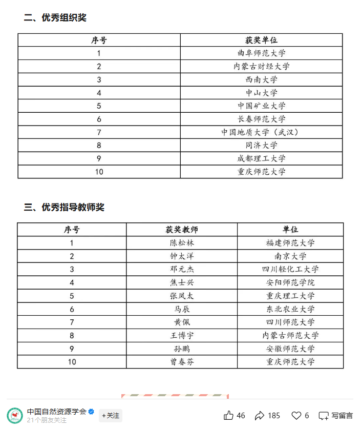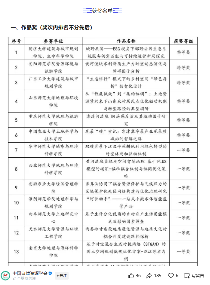 学院在此向获奖师生报喜并致以诚挚祝贺!期待全院同仁以此为励,精进不休,为推动自然资源事业高质量发展贡献更多重师地理人的智慧与力量。