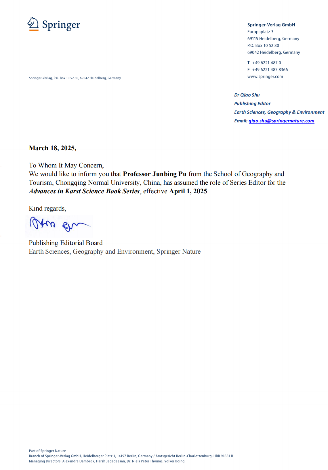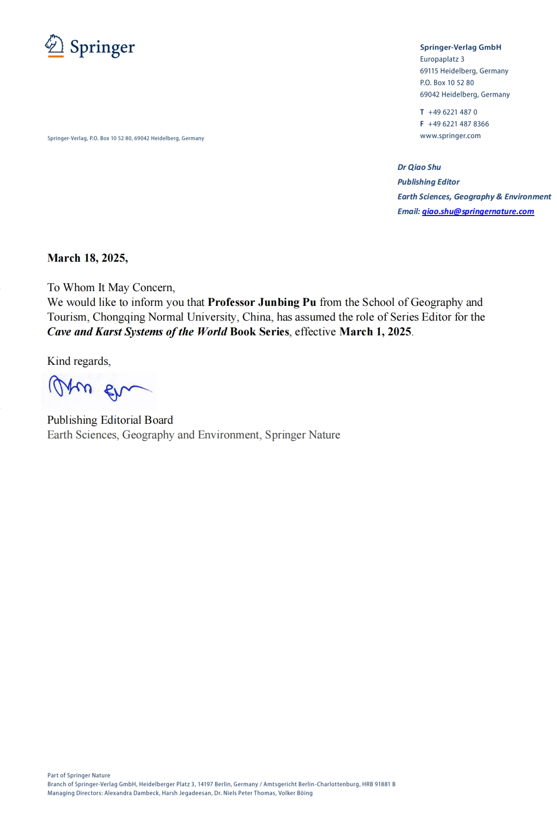蒲俊兵研究员受邀担任两套丛书的共同主编,彰显了换妻 岩溶学研究的国际影响力,对推动学科发展和人才培养具有深远的意义。