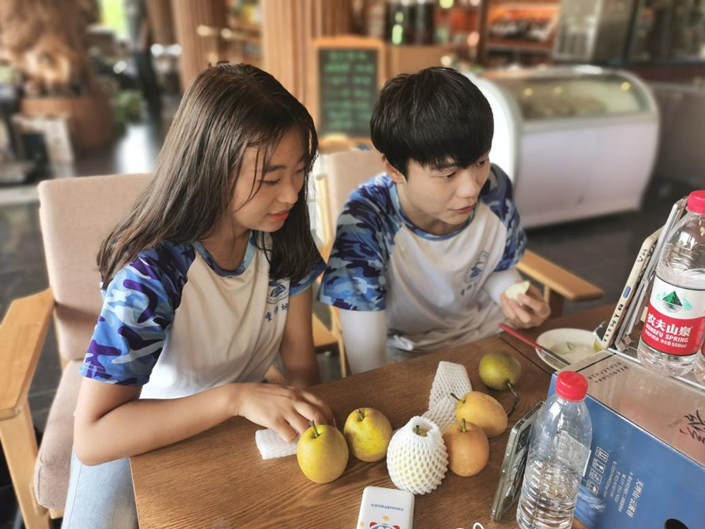 队员龙飞宇和陈萧萧担当主播,正在为观众介绍二圣梨(周芷仪 摄)