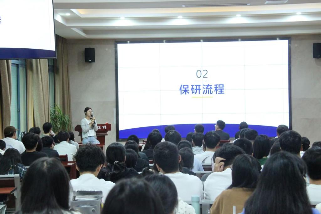 其次余训艳学姐以“心之所向,素履以往”为主题,从保研流程,专业学习和心得分享三个方面展开,在保研流程介绍中给出了科研经历>成绩排名>英语水平>竞赛实践>学生工作的心得,告诉同学们无论是保研还是考研都要时刻坚持好好学习,至少能保证在大四的时候不是被动选择而是有更多的选择机会。