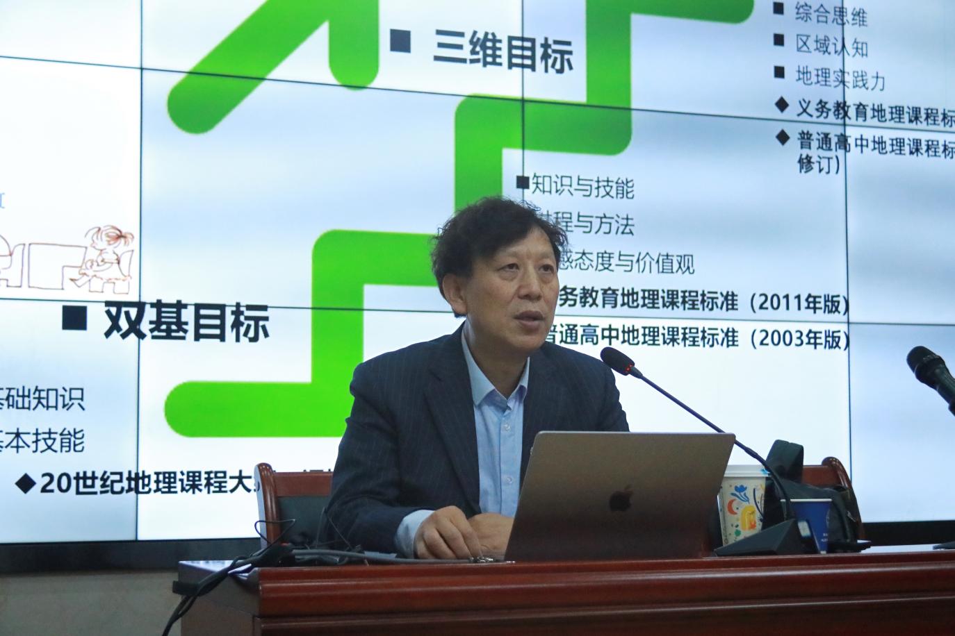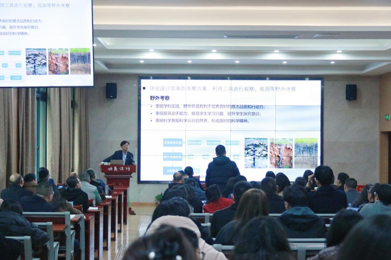 讲座开始,段教授进行简单的自我介绍后就本次讲座主题“地理核心素养与教学改革——地理实践力为例”提出五大点:一.地理实践力国家课程要求;二.地理实践是地理学的学科本质;三.地理实践力是地理育人的重要突破口;四.对国际地理实践的重视;五.落实与考查地理实践力的方法。