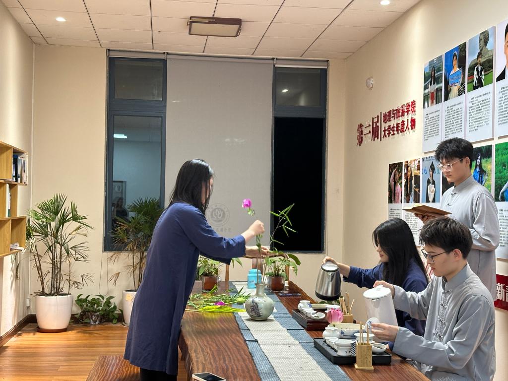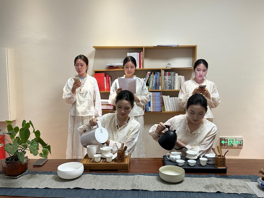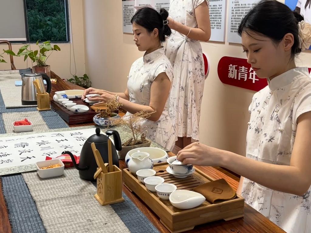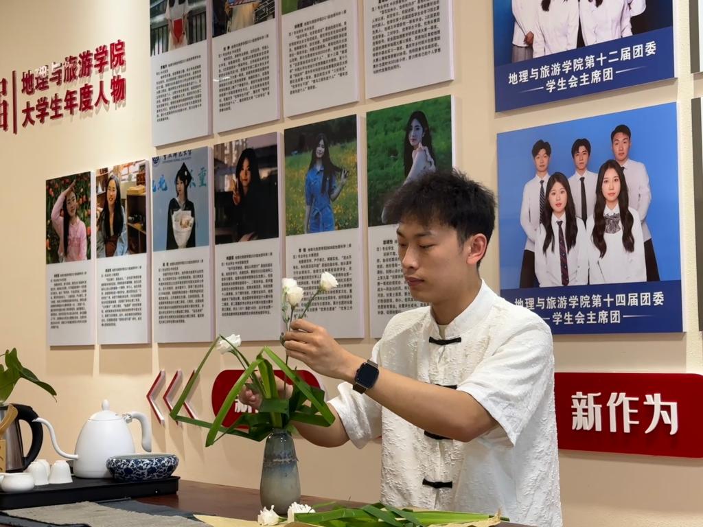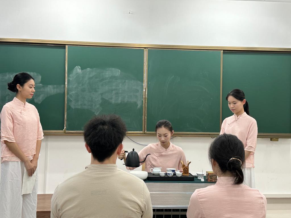 实践活动现场,同学们精心打造的文化空间令人耳目一新,融合了插花、焚香、挂画等传统元素:清雅的插花点缀茶席,袅袅沉香营造意境,文人字画增添雅韵。特别值得一提的是,同学们创造性地融入了吉他演奏,悠扬的琴声与传统茶道相得益彰,展现了古今文化的和谐对话。这种跨界融合不仅展现了当代青年对传统文化的创新理解,也为茶文化的现代表达提供了新思路。