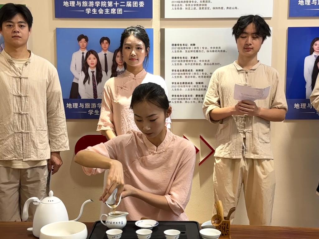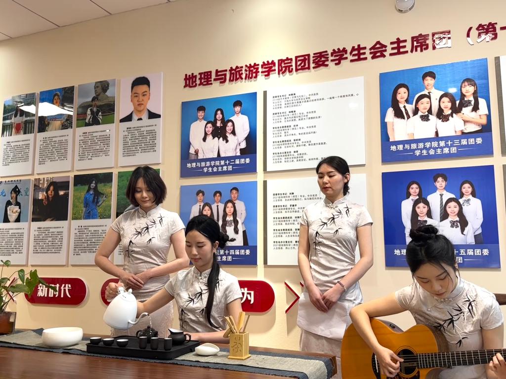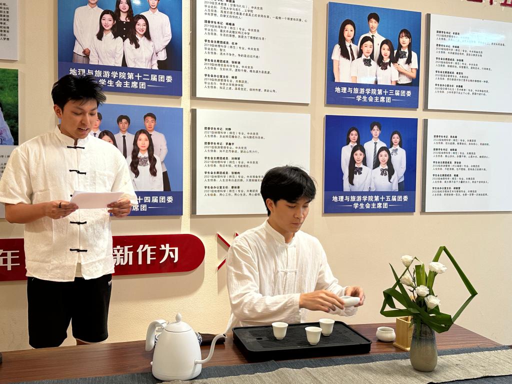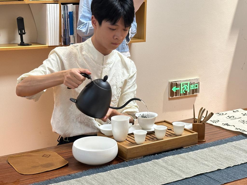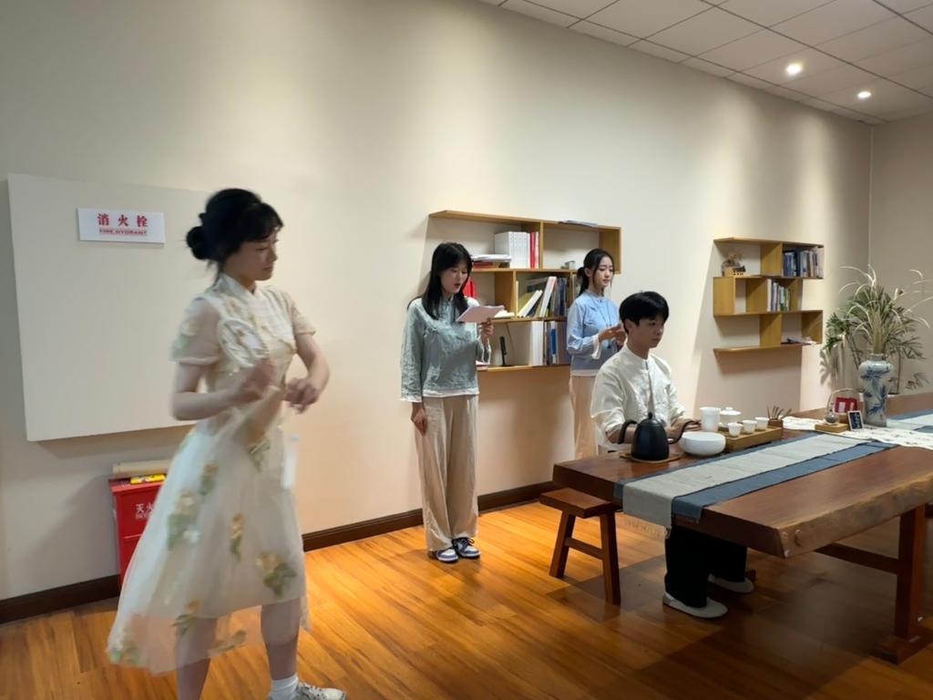 实践活动现场,同学们精心打造的文化空间令人耳目一新,融合了插花、焚香、挂画等传统元素:清雅的插花点缀茶席,袅袅沉香营造意境,文人字画增添雅韵。特别值得一提的是,同学们创造性地融入了吉他演奏,悠扬的琴声与传统茶道相得益彰,展现了古今文化的和谐对话。这种跨界融合不仅展现了当代青年对传统文化的创新理解,也为茶文化的现代表达提供了新思路。